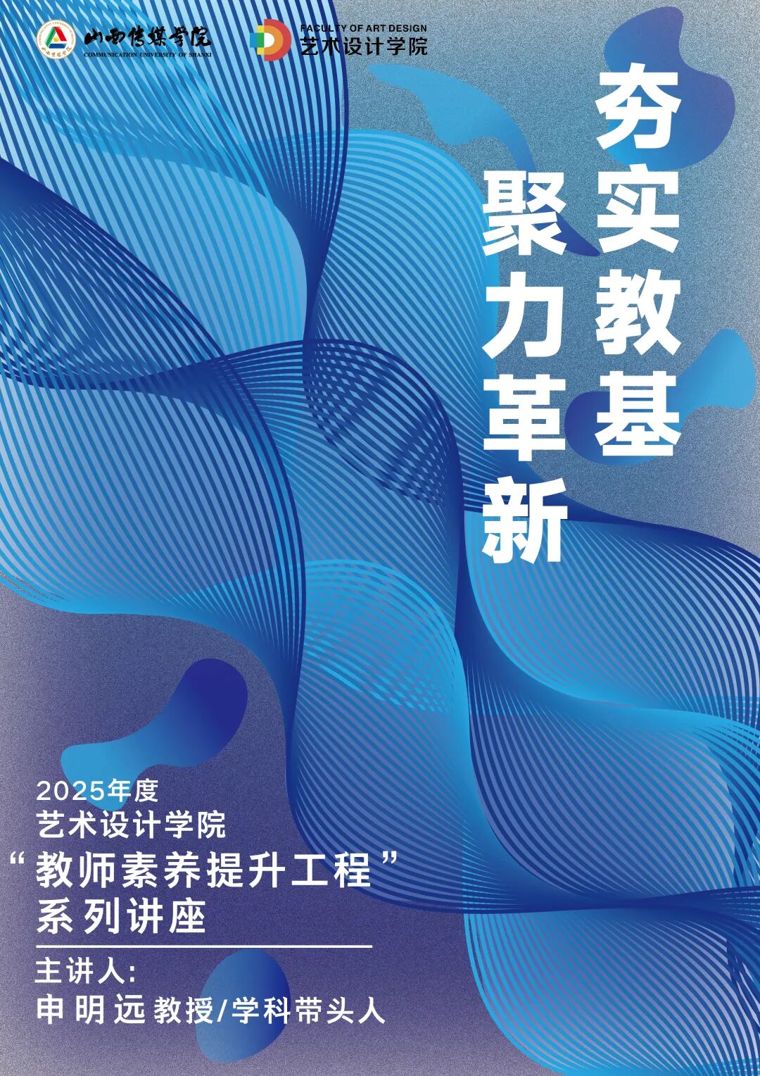 为加强师资队伍建设,深化教育教学改革,11月27日下午,艺术设计学院正式启动2025年度“教师素养提升工程”系列讲座。首场讲座特邀设计学科带头人申明远教授担任主讲,以“夯实教基·聚力革新”为主题,为全院教师带来一场思想深刻、内容丰富的专题讲座。