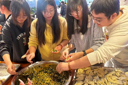 老师们也放下忙碌,走进人群与我们并肩动手,指尖捏着饺子褶,口中聊着日常趣事,课堂上的严谨与距离感悄然消散,取而代之的是家人般的亲切与温暖。