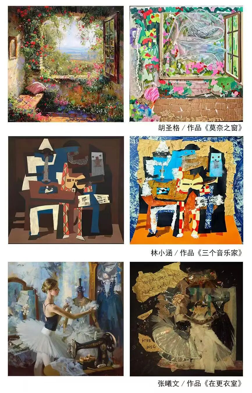 此外,经典艺术作品的材质再创作为课程增添了独特亮点。学生们以中外名画为灵感来源,突破原作的呈现方式,运用综合材料进行重塑与解读——或以彩纸、绳线拼贴,或以黏土与铁丝再现,或以废旧布料与颜料重组,既保持原作的艺术精髓,又借助材料转换赋予作品崭新的视觉感受,虚实间营造出新意象,完成了经典与当代的设计交融。