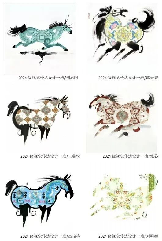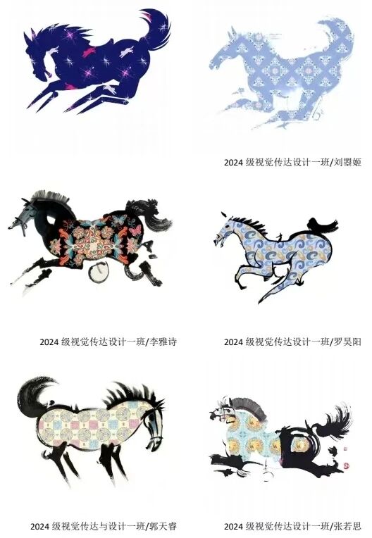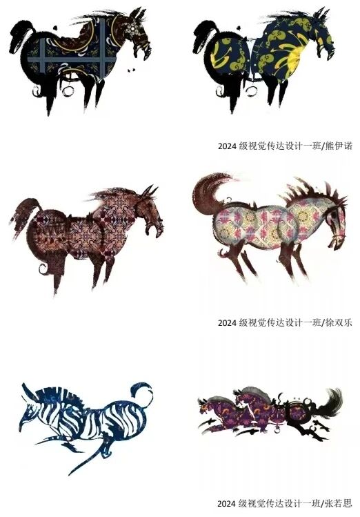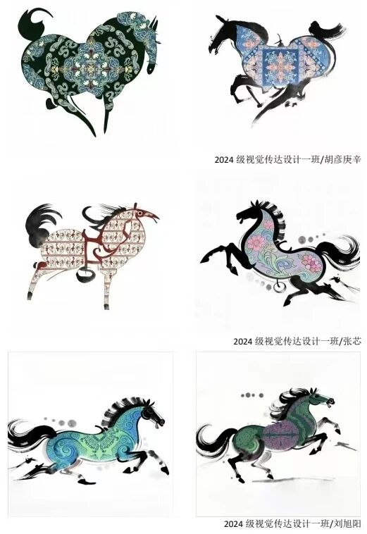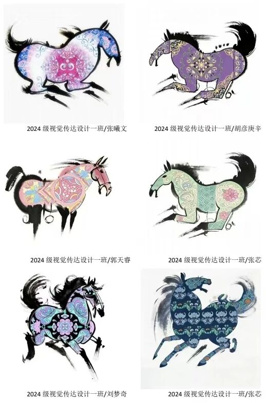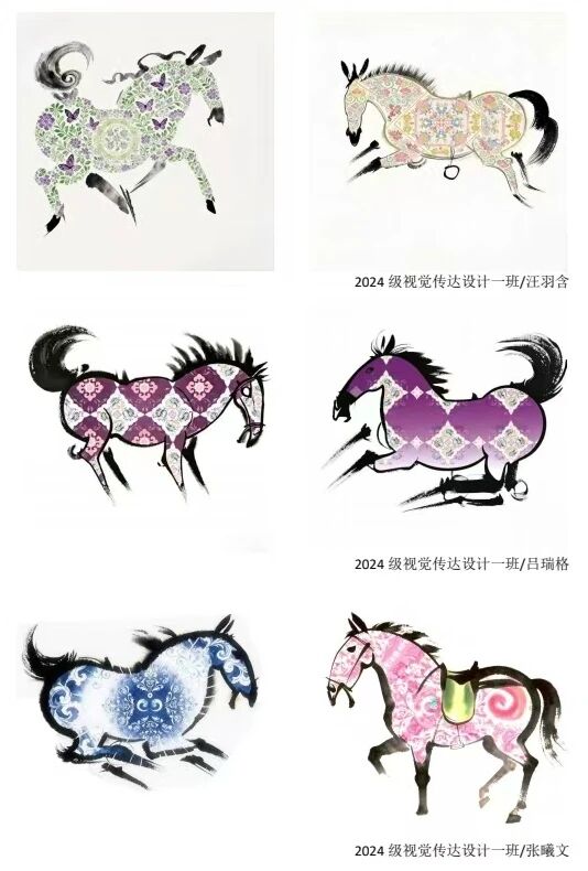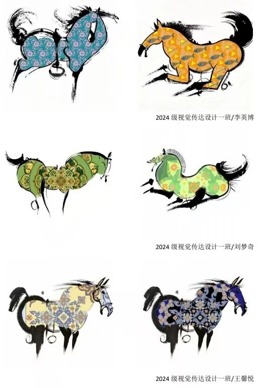 2024级视觉传达设计一班的同学们,正是在这样的课程浸润中,将图案设计的专业知识,转化为对马年主题的独特诠释。他们以韩美林先生的马为创作基底,提取其笔墨间的灵动与力量,再融入自己对传统纹样的理解与重构,让古老的图案语言,在当代设计语境中焕发新生。本次图案课程大家收获颇多,有机地结合了数字化技术,接下来就让我们一起来欣赏一下同学们的学习成果吧!