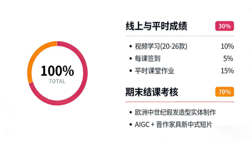 课程总成绩= (视频学习10%+签到考核5%+课堂作业15%)× 30% + 期末作业(假发作业30%+期末发型视频40%) × 70%