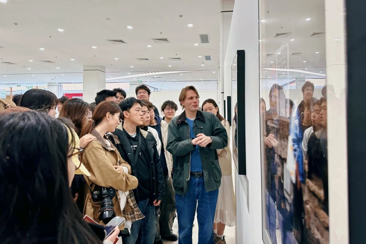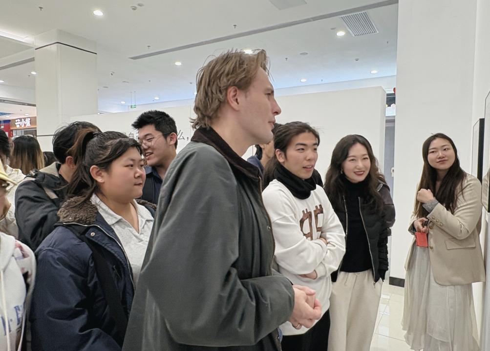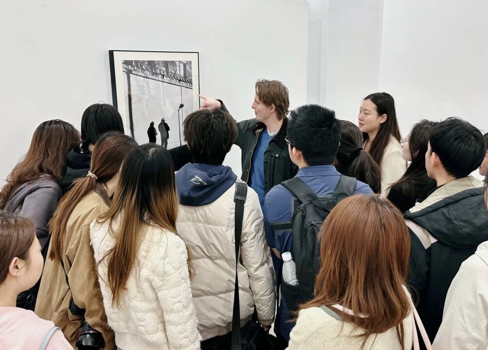 与此同时,挪威青年摄影师保罗·吉布森个展同期开展,摄影师亲临现场,全程为师生细致解读参展作品。他结合每一幅作品的创作背景、拍摄思路与表达内核,分享了街头摄影的创作技巧、瞬间捕捉的核心逻辑,以及当代青年摄影师的创作思考。同学们认真聆听、积极提问,就创作灵感、器材选择、后期处理等专业问题与摄影师展开互动交流,现场学习氛围热烈。